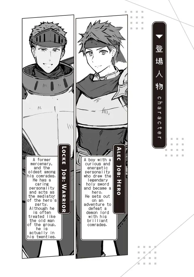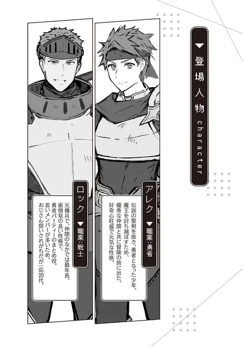 Then I guess I'm next! I'm Alec! My class is Hero. I've always admired Adventurers. A while back, when I was playing near the holy sword in my home village, I ended up pulling it out . . . After that, I trained under my master until today.