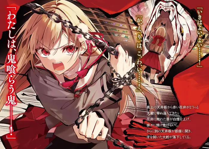 Nadeshiko shot a light glare at the man, Kirihito Gokumon, and then bent over as she began to efficiently gather the scattered heads and limbs of the inhuman creature into one place.