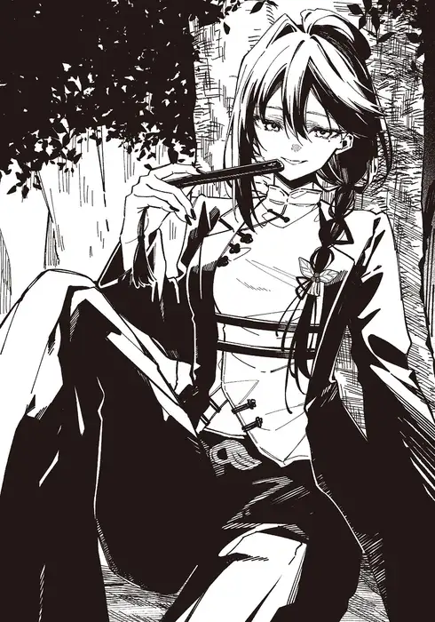 Dismissing the girl's subtle confusion like a passing breeze, Amana swiftly snapped open and waved around her black fan decorated with intricate cut-out designs, narrowing her amber eyes in amusement.