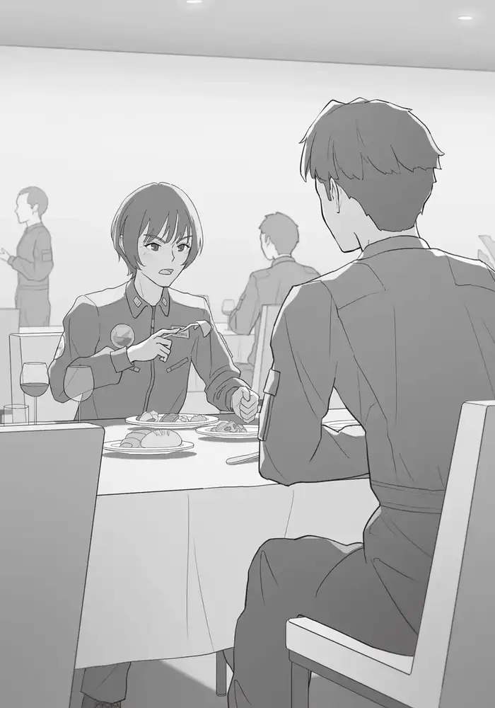 A middle-aged man sits down uninvited in front of Riku—the Captain of the Italian Air Force. In his left hand, he holds a bottle of red wine, and in his right, two glasses. He was practically saying—