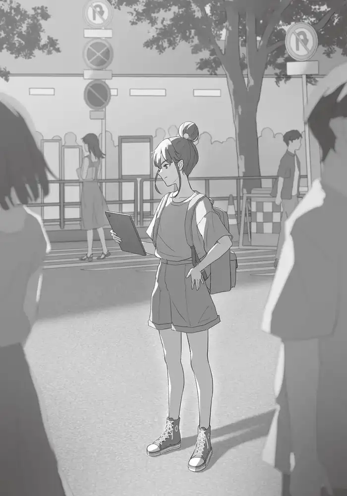 Riku turns towards the source of the voice. There, a bun tied atop her head bobbed through the crowd. Dressed in a drop-shoulder shirt, short pants, and canvas sneakers, she looks like a middle schooler or at best a high schooler from her height. The size of her backpack emphasizes her petite frame.