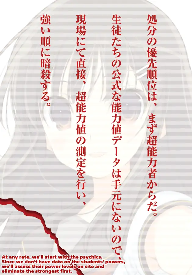 The lab was on the fourth floor of the school building. Any normal person jumping from that window would end with a crunch, but Masahiro was a powerful psychokinesis user, and could probably hit the brakes just before impact.