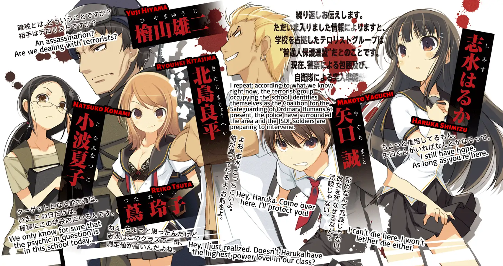 Class 1-6, 1-5, 1-4; even on the small cellphone screen, it was easy to see inside each class. Inside every one there was one or two terrorists in special forces gear with automatic rifles in hand. Dozens of ropes, presumably used for their infiltration, dangled against the school walls, swaying in the wind. The camera then shifted to class 1-1, the hallway, the stairs, and finally settled on the science lab where Makoto and his classmates were holed up. The school building started getting smaller again until it was replaced by the reporter's face.