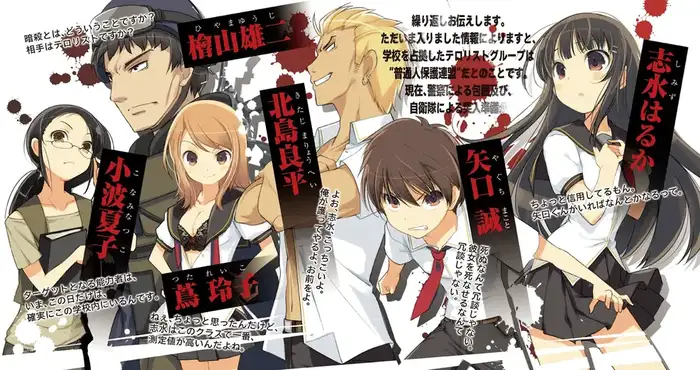 Class 1-6, 1-5, 1-4; even on the small cellphone screen, it was easy to see inside each class. Inside every one there was one or two terrorists in special forces gear with automatic rifles in hand. Dozens of ropes, presumably used for their infiltration, dangled against the school walls, swaying in the wind. The camera then shifted to class 1-1, the hallway, the stairs, and finally settled on the science lab where Makoto and his classmates were holed up. The school building started getting smaller again until it was replaced by the reporter's face.
