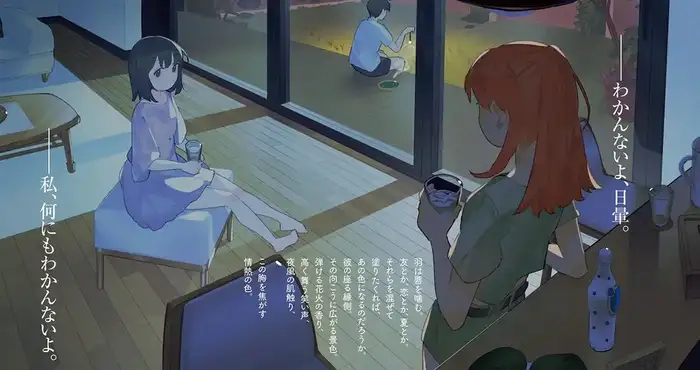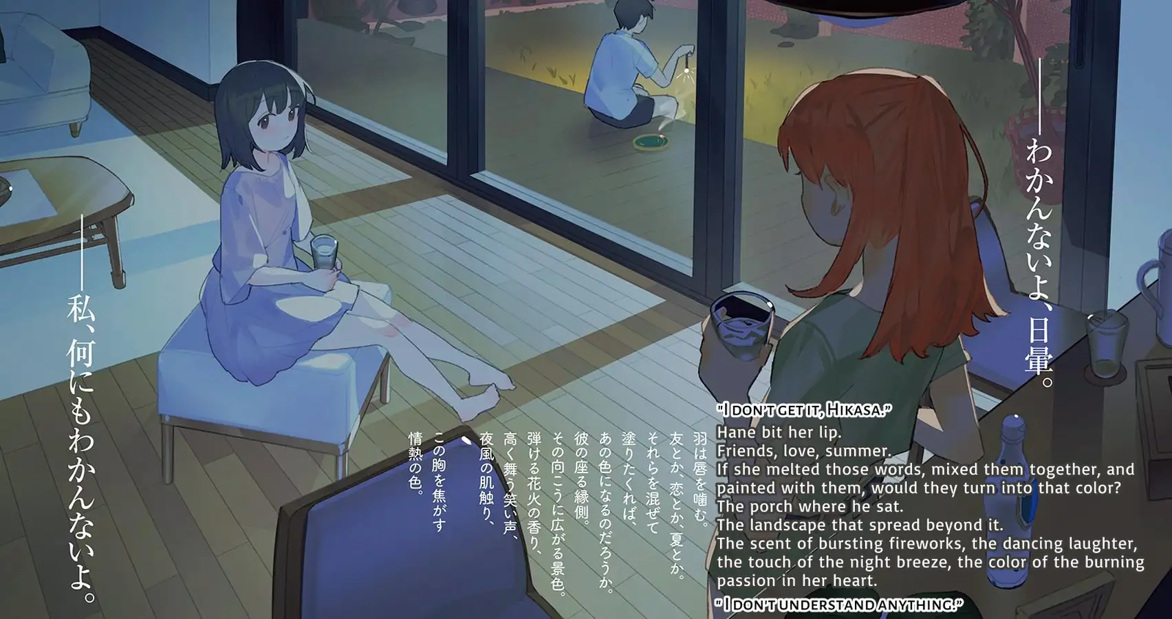 After breathing, Hane spoke again. It only took that single breath for the three of them to remember the events of the year before. They pictured the summer sky and smelled the sea air. Bright, cheerful voices echoed in their ears, though quieter by one. Together, they remembered her smile and the path to the sea. That memory was elusive yet painfully clear in its brightness.
