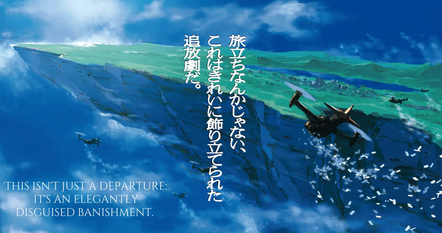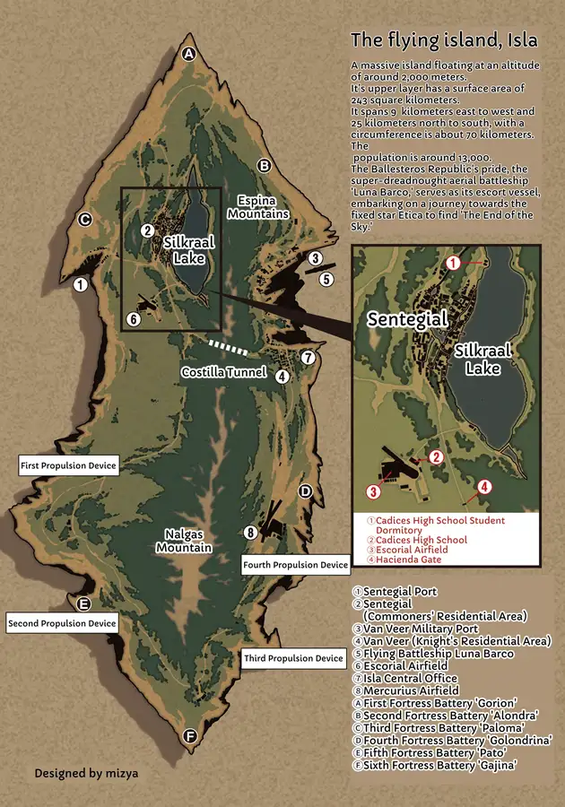 Ten years ago, they succeeded in capturing this floating island, which had appeared out of nowhere and the destination was unknown. Thousands of wires were hooked onto Isla's surface and lower rock stratum using aircraft, tethering it 2000 meters above the ground. Since then, geological surveys, component analysis, propulsion device installation, construction of six gun emplacements, residential areas, and harbors for aerial ships have been done in preparation for this day.