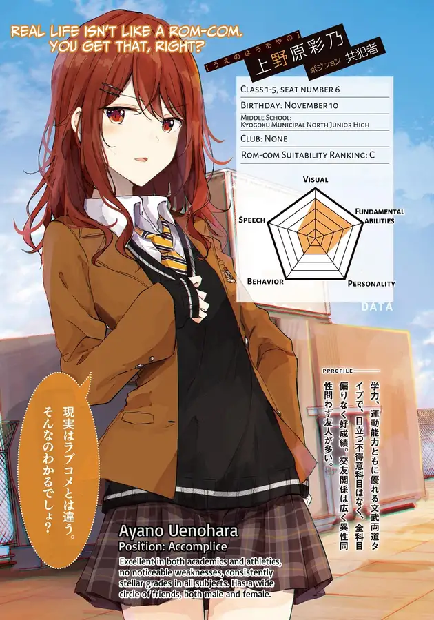 Ayano Uenohara. Class 1-5, seat number 6. Born November 10. Went to Kyogoku Municipal North Junior High and was in the track-and-field team. Excellent in both academics and athletics, no noticeable weaknesses, consistently stellar grades in all subjects. Ranked 8th in entrance exams. Placed third in the 800 meters at the prefectural junior-high meet. Has a wide circle of friends, both male and female. Loves sweets, dislikes convenience-store bentos.